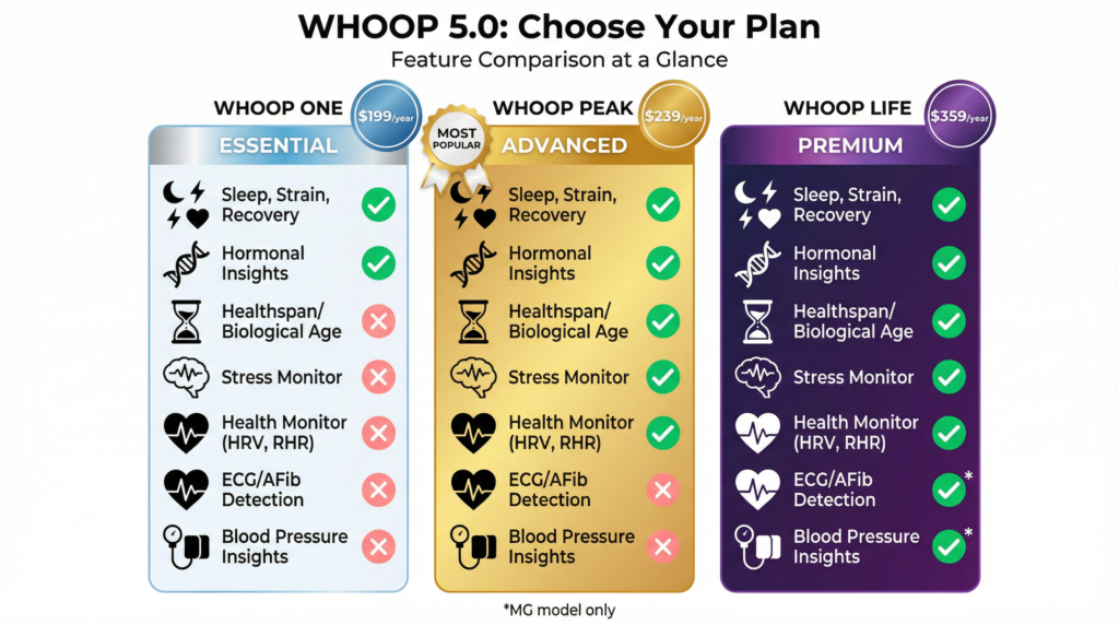 Life at $359/year is exclusive to Whoop MG and includes ECG, AFib detection, blood pressure insights, and all Peak features.